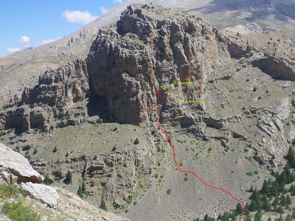5 Ağustos günü (yani dağa ulaştığımız gün), DAG’ dan sevgili Yahya ve David arkadaşlarımızın Kaletepe güney yüzünde açtıkları ve toplam 6 ip boyundan oluşan YELKOVAN isimli rotalarına giriyoruz. Rotanın giriş ve 2. ip boyunu, fotoğrafta görüldüğü gibi farklı bir yoldan, varyant ile bağlıyoruz. İlk 2 ip boyundan oluşan varyant bizi epeyce zorluyor. Zorlu bir yüzeyi emniyetsiz geçiyoruz (6, 6+). Ardından Yelkovan rotasına bağlıyoruz fakat hava kapatıyor ve yağmur yağıyor. Güzel bir babanın çıkıntısına pursik dolayıp aşağı topukluyoruz.