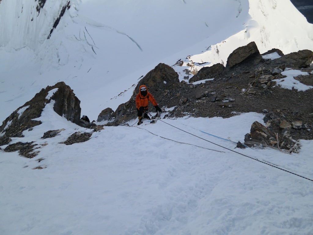 Arada 10-15 metrelik dik III-IV derece kaya-kar-buz etaplarını geçiyoruz. Bir süre sonra iki Ukraynalı, gruplarından ayrılıp dönme kararı alıyor. Önden ben, Behzad, Ukraynalı iki dağcı ve Volkan şeklinde yükseliyoruz. 6700-6750 metre civarında 12-14 metrelik tırmanması çok keyifli minik bacalardan oluşan bir etap geçiyoruz. Bu zevkli etap bitince sağa doğru bir travers ve 8-10 metrelik dik bir etabı geçtikten sonra “Bıçak” denen sırta ulaşıyoruz ve son zirve sırtına çıkıyoruz. Saat 14.20-14.30 gibi çantalarımızı bırakıp Behzad ile zirveye çok yavaş adımlarla ilerliyoruz ve saat 15.26’ da zirveye varıyoruz.